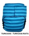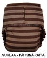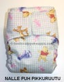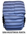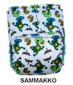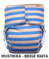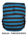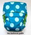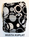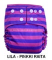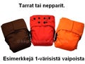 Hoito-ohje: Käytön jälkeen vaippa huuhdellaan (kakka irrotetaan tarvittaessa käsisuihkun avulla vessanpönttöön) ja jätetään odottamaan pesua, ei tarvitse liottaa. Pesu 40-60 asteessa (trikoiset 40, keinokuituiset 60 asteessa) kestovaipoille soveltuvalla pesuaineella (ei zeoliittia ja saippuaa alle 5%, käytä vain 1/3 suositellusta pesuainemäärästä) siivekkeiden tarrat suljettuina, jos kyseessä on tarrallinen vaippa. Vältä huuhtelu- ja valkaisuaineita. Saa rumpukuivattaa. Vaipan voi pestä perheen muun pyykin mukana. Pestään ennen ensimmäistä käyttökertaa.