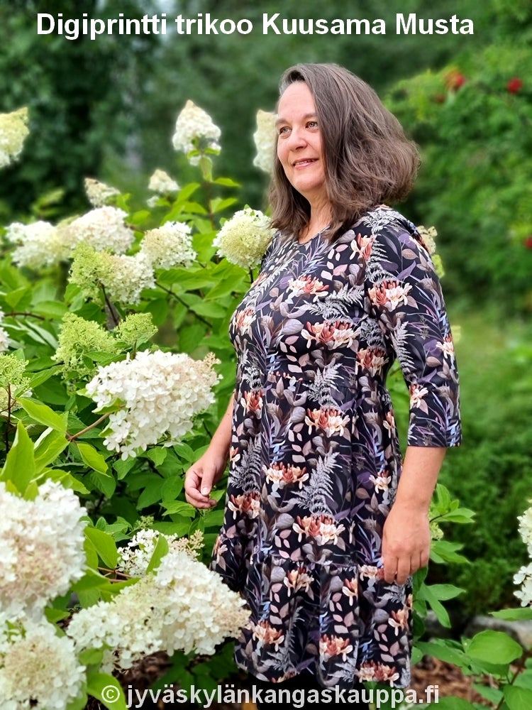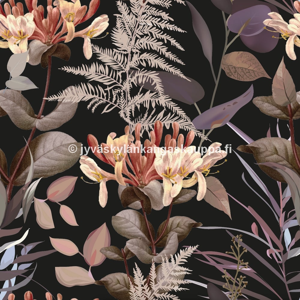 Digiprintti trikoo Kuusama, tuoksuköynnöskuusama mustalla taustavärillä.