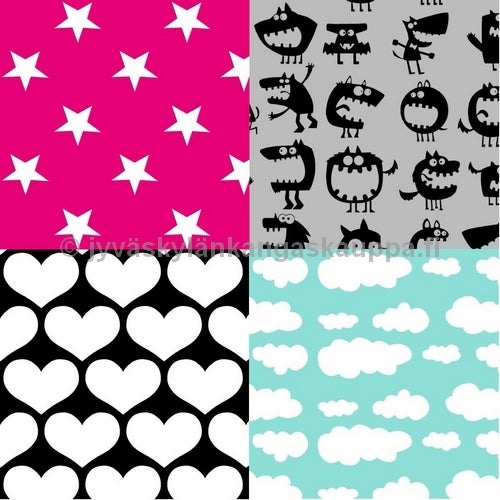 Jos tilaat 10kpl = 1m, paketti sisältää tällöin vähintään yhden 30cm:n palan kangasta (eli paketissa ei ole esim. 10kpl 10cm:n palaa vaan vähintään yksi isompi pala, voi olla myös esim. yksi 70cm:n pala varastotilanteesta riippuen). Alle metrin paketeissa kankaat ovat satunnaisia mittoja, mutta kuitenkaan mikään kangas ei ole alle 10cm korkea (täysi leveys kaikissa kankaissa!).