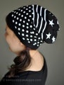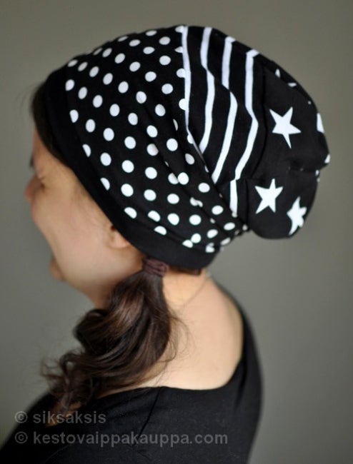 Lisäkuvissa on hauskat tilkkupipot, jotka voi ommella pakanlopuista tai muista ylijäämätilkuista. Ohjeet ja kaava löytyy SikSakSis blogista. Pipon toteutukseen tarvitsee kuosikankaita ja 1-väristä single trikoota molempia 30cm (yht. 60cm kangasta).