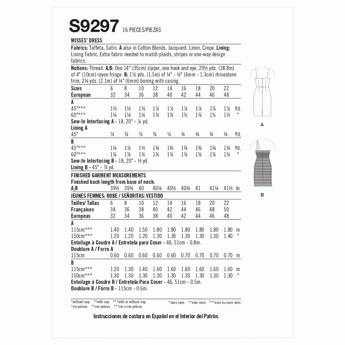 Close-fitting dress has lined bodice with boning, lapped centre back zip and back vent. A: sweetheart neckline and self fabric straps. B: purchased rhinestone trim straps and fringe trim.