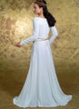 Floor length dress has close-fitting, lined, drop, shaped bodice, with princess seams, long sleeves, flared skirt with godets and back zipper closing.