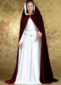 Lined, floor length cape has hood, gathered neckline and decorative closure.