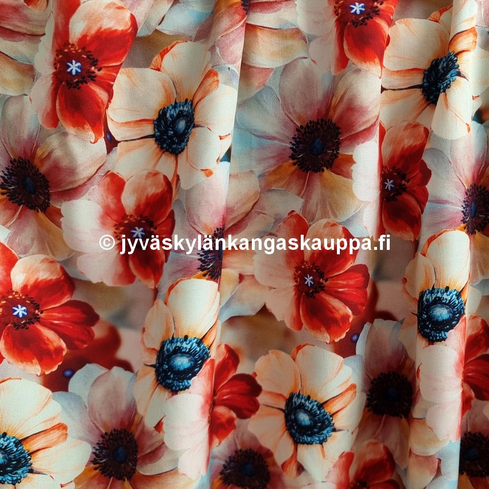 Mainio kangas hulmuavaan kesämekkoon, hameeseen, paitapuseroon sekä muuhunkin ilmavaan ja kevyeen vaatetukseen.