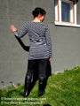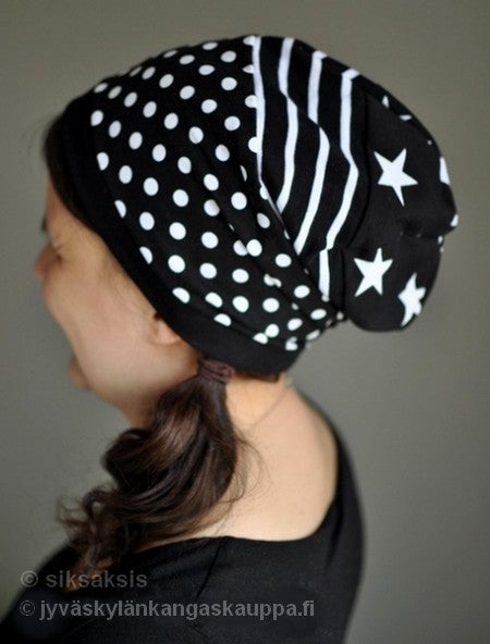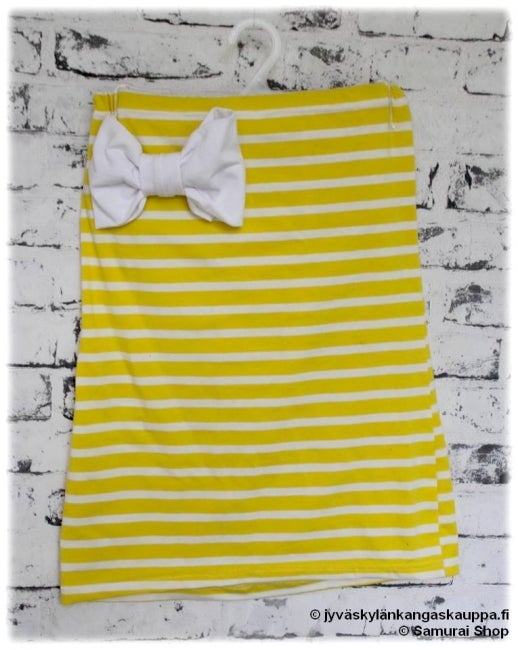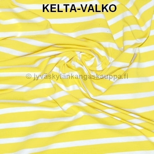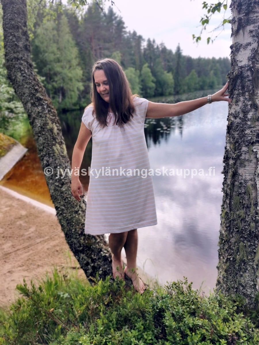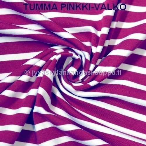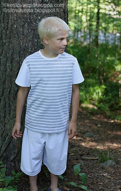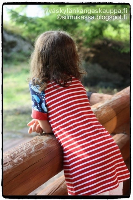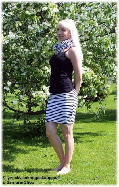 Vinkki: Suurin osa kankaan kuiduista on puuvillaa. Puuvilla luonnonkuituna kutistuu pesussa, joten kannattaa varata tarpeeksi kutistumisvaraa jo kankaan ostovaiheessa. Kudotuissa raidoissa saattaa olla joitakin vääränvärisiä irtokuituja seassa. Kuidut saa yleensä nypittyä pois neulaa apuna käyttäen.