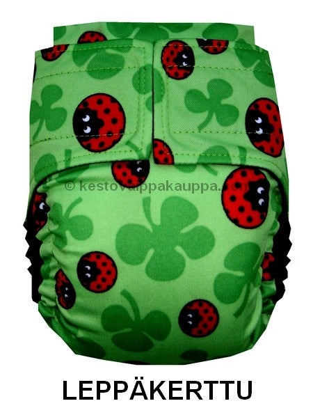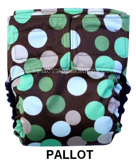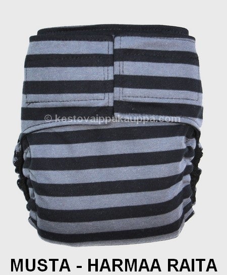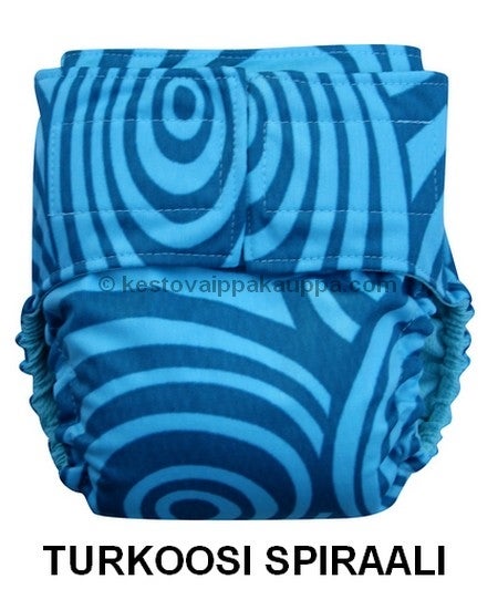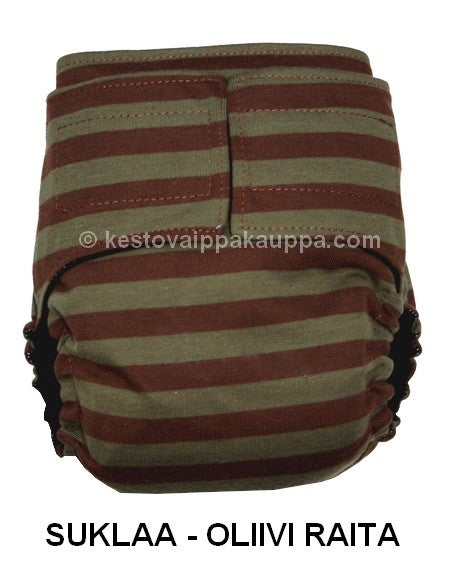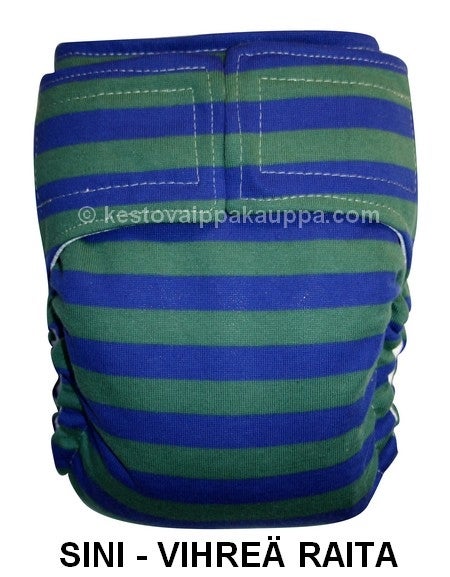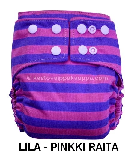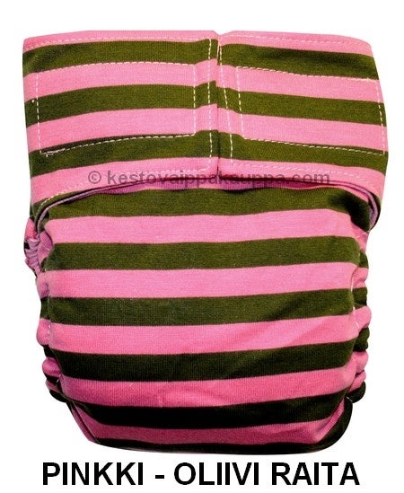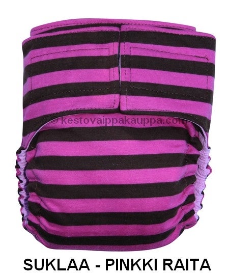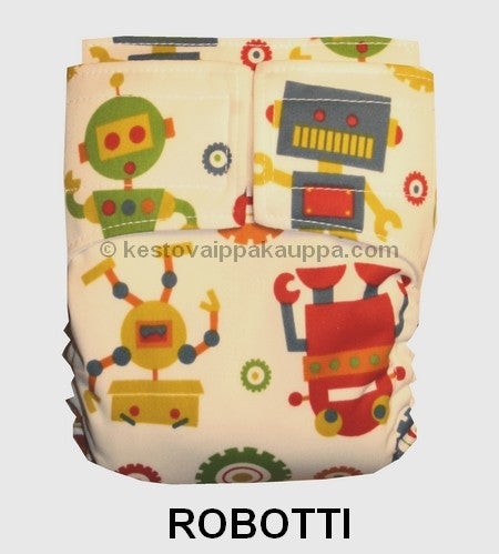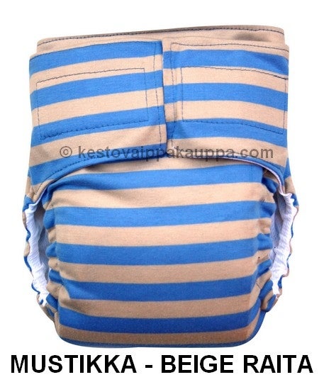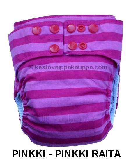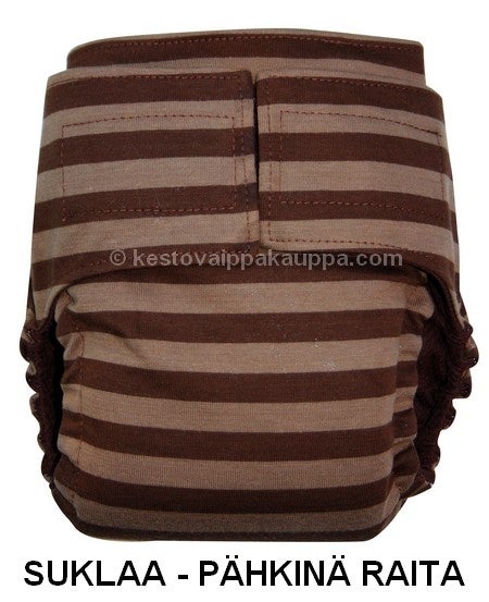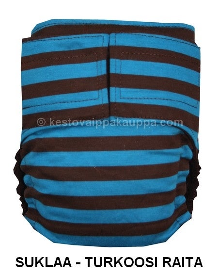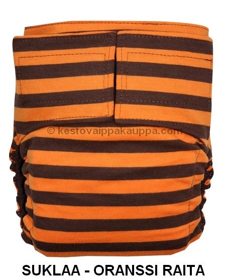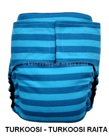 Hoito-ohje: Käytön jälkeen vaippa huuhdellaan (kakka irrotetaan tarvittaessa käsisuihkun avulla vessanpönttöön) ja jätetään odottamaan pesua, ei tarvitse liottaa. Pesu 40-60 asteessa (trikoiset 40, keinokuituiset 60 asteessa) kestovaipoille soveltuvalla pesuaineella (ei zeoliittia ja saippuaa alle 5%, käytä vain 1/3 suositellusta pesuainemäärästä) siivekkeiden tarrat suljettuina, jos kyseessä on tarrallinen vaippa. Vältä huuhtelu- ja valkaisuaineita. Saa rumpukuivattaa. Vaipan voi pestä perheen muun pyykin mukana. Pestään ennen ensimmäistä käyttökertaa.