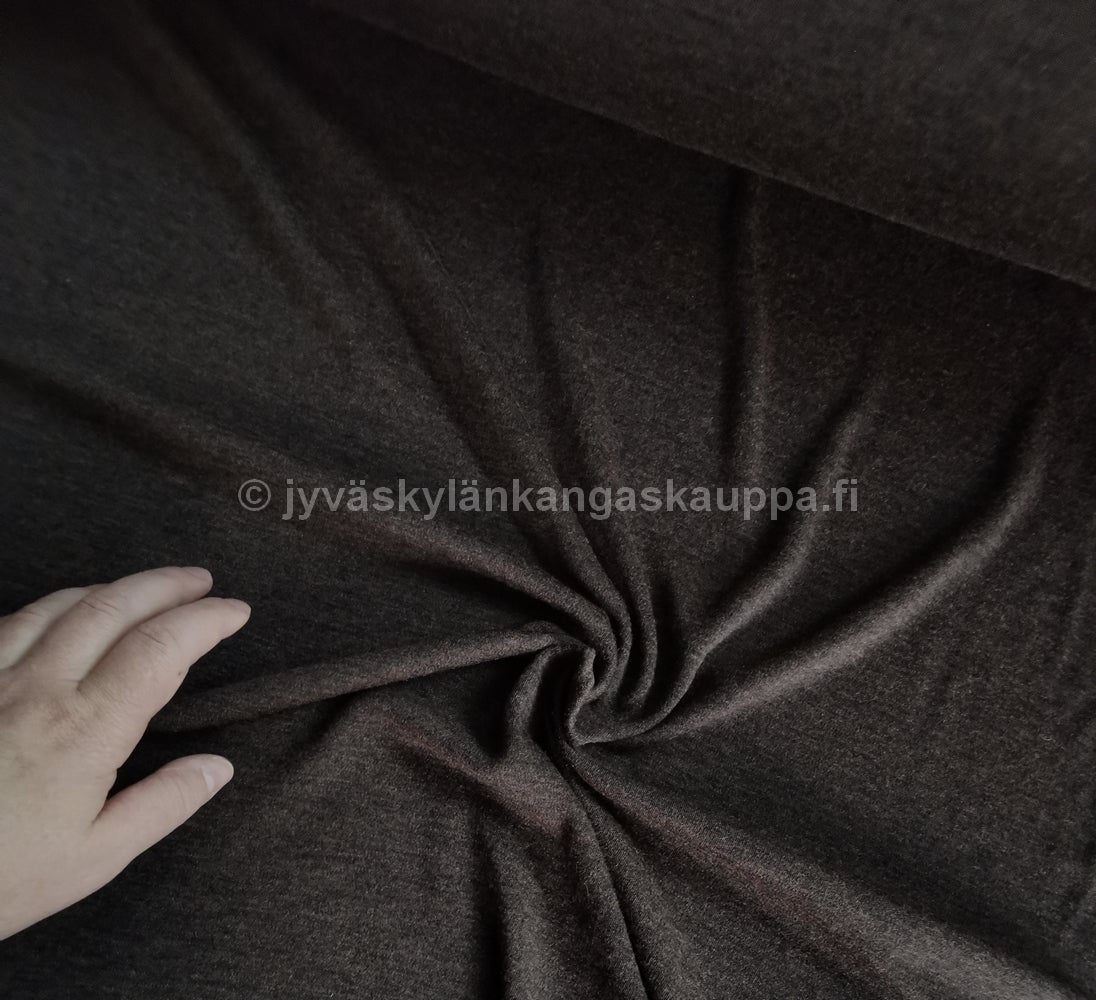 Suomessa neulottu merinovilla, mulesing vapaa. Meleerattu sävy, jossa vaihtelee tummanruskea ja musta.